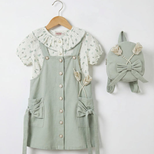 Girls Pinafore Dress with Bow Pockets & Floral Blouse — Outfit + Mini Backpack